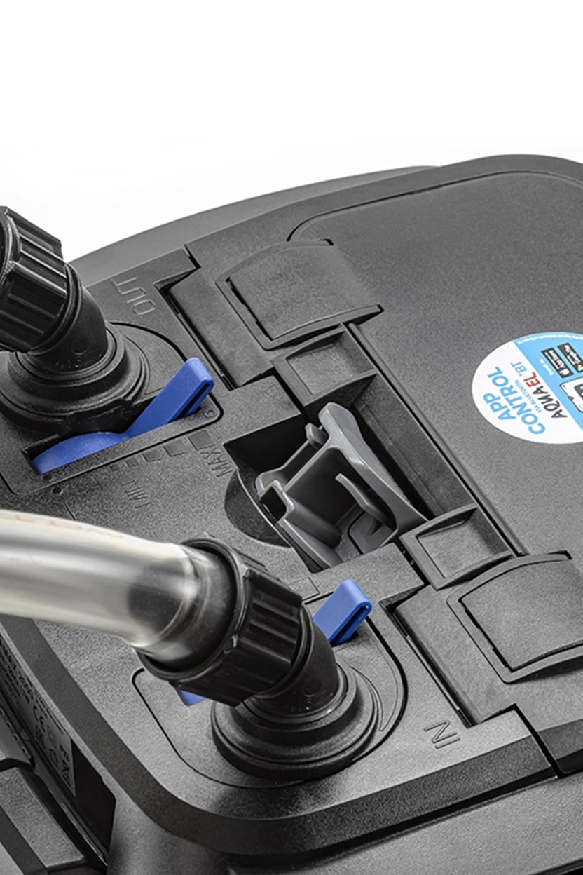 El filtro se adapta al ritmo diario, permitiendo un flujo regulado que imita las condiciones naturales diurnas y nocturnas. Además, durante la alimentación de los peces, el flujo se reduce para evitar estrés. El Ultramax BT cuenta con soluciones patentadas como un prefiltro, sistema de doble válvula de bola y sistema de autocebado, que facilitan su uso y mantenimiento. El prefiltro, con capacidad de 0.6 litros, atrapa residuos grandes, reduciendo la frecuencia de mantenimiento y protegiendo los medios filtrantes.